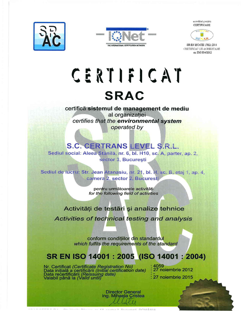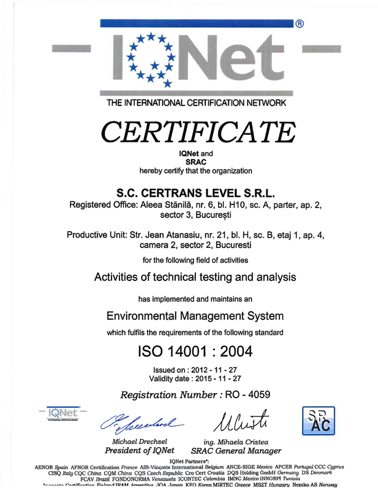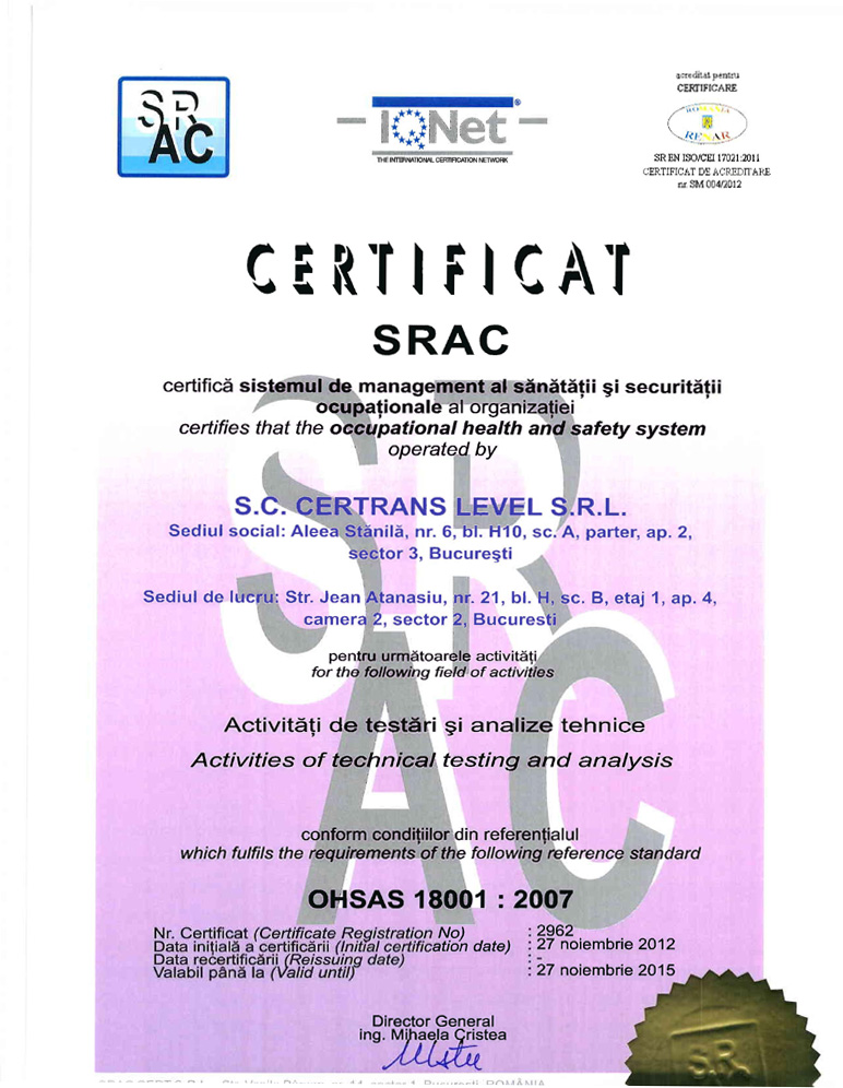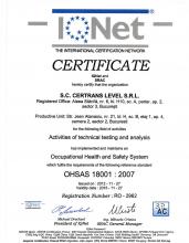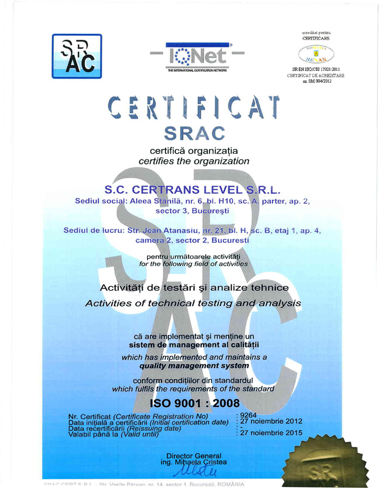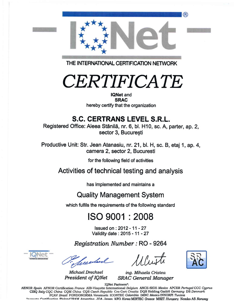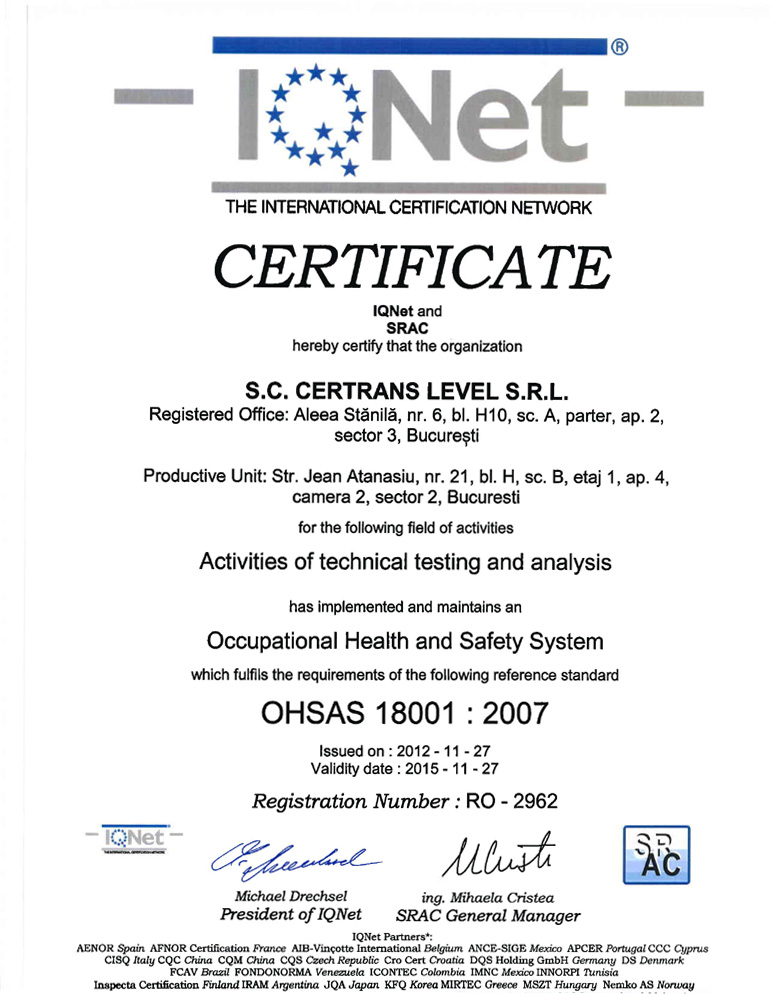 Firma CERTRANS LEVEL este atestata SRAC si IQNet – pentru ISO 9001:2008, SR EN ISO 14001:2005, OHSAS 18001:2007.
